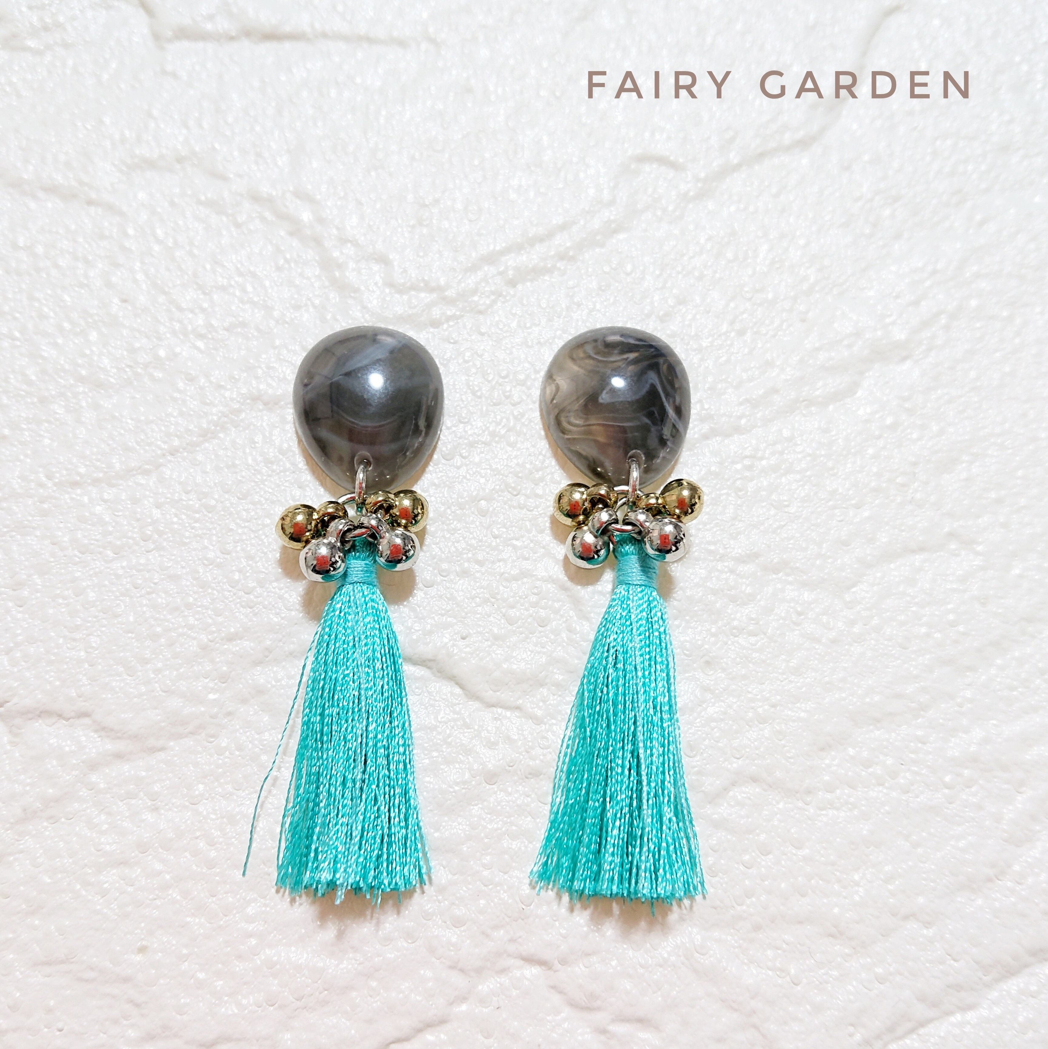 しずく型カボションにつぶつぶボールとタッセルを合わせ上品さと華やかさのある大人ピアス