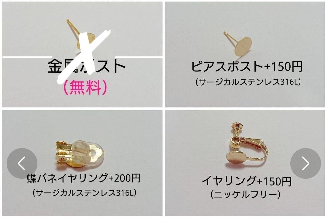 ★作品に使用する耳につける金具は、金属アレルギー対応のサージカルステンレス、ニッケルフリーを使用しています